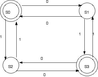 Here is a simple example. By convention, the states in F are double circled. Labeled arrows indicate transitions. Exercise: what is the language of this machine?