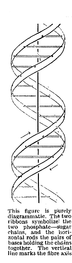 The novel feature of the structure is the manner in which the two chains are held together by the purine and pyrimidine bases. The planes of the bases are perpendicular to the fibre axis. The are joined together in pairs, a single base from the other chain, so that the two lie side by side with identical z-co-ordinates. One of the pair must be a purine and the other a pyrimidine for bonding to occur. The hydrogen bonds are made as follows : purine position 1 to pyrimidine position 1 ; purine position 6 to pyrimidine position 6.